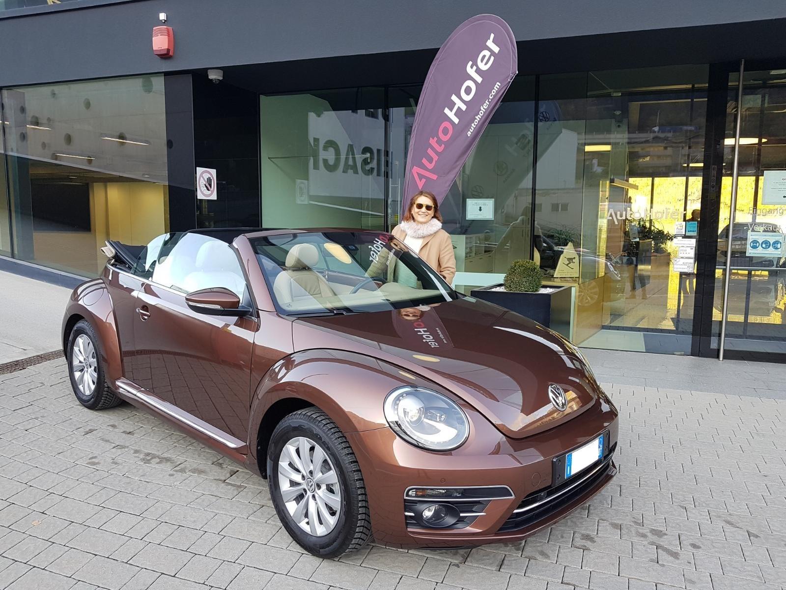 Questa Volkswagen Maggiolino Cabrio importata è pronta per un giro con la sua nuova proprietaria Heidi! Tutto lo staff di Auto Hofer ti augura tanto divertimento di guida in estate.