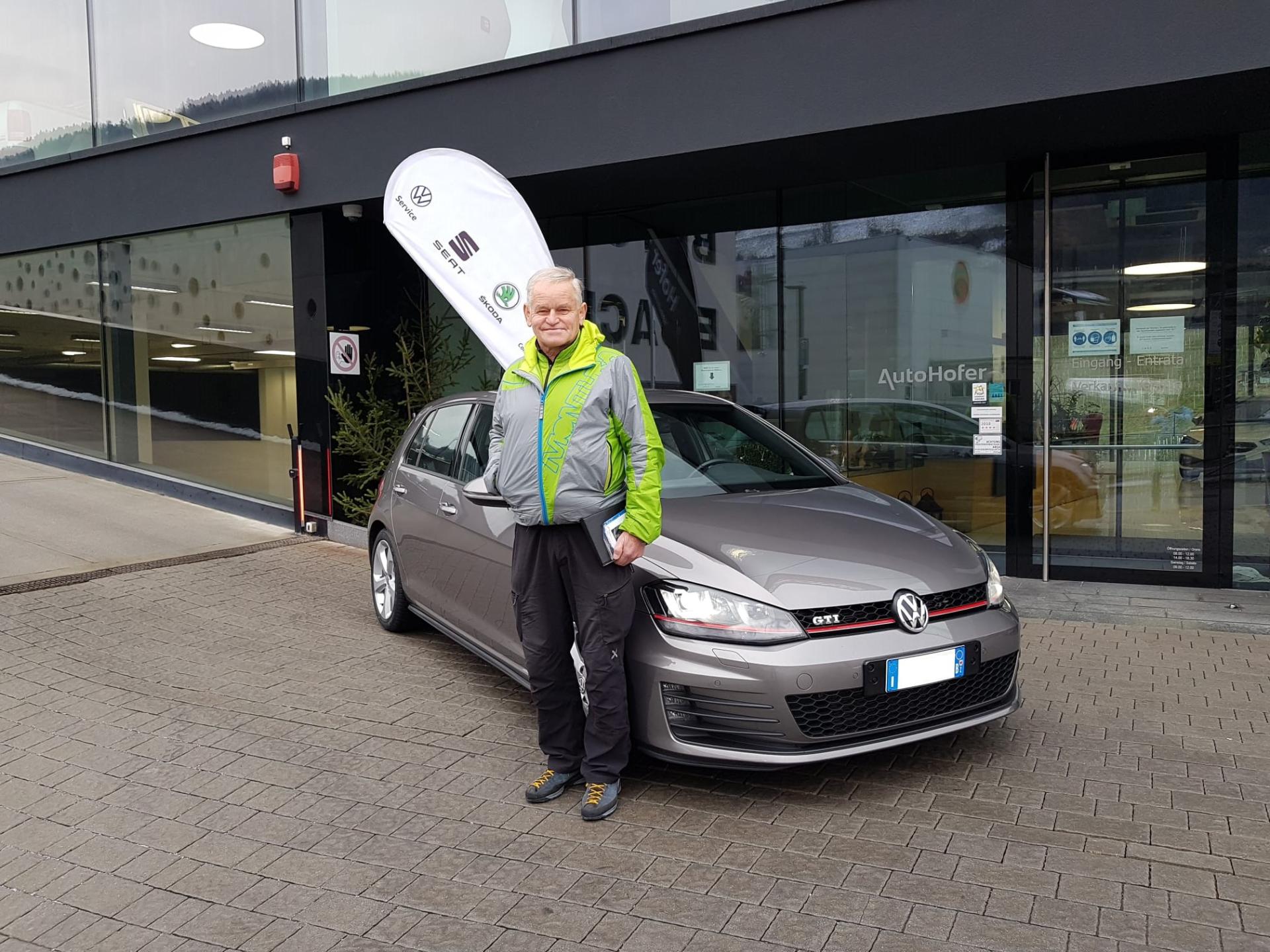 Alfred e il suo nuovo acquisto: d'ora in poi é in viaggio con questa Volkswagen GTI! Siamo convinti che impressionerai tutti con l'aspetto sportivo della Volkswagen Golf. Tutto lo staff di Auto Hofer ti augura tanto divertimento e, naturalmente, un viaggio sicuro con il tuo nuovo compagno su quattro ruote.