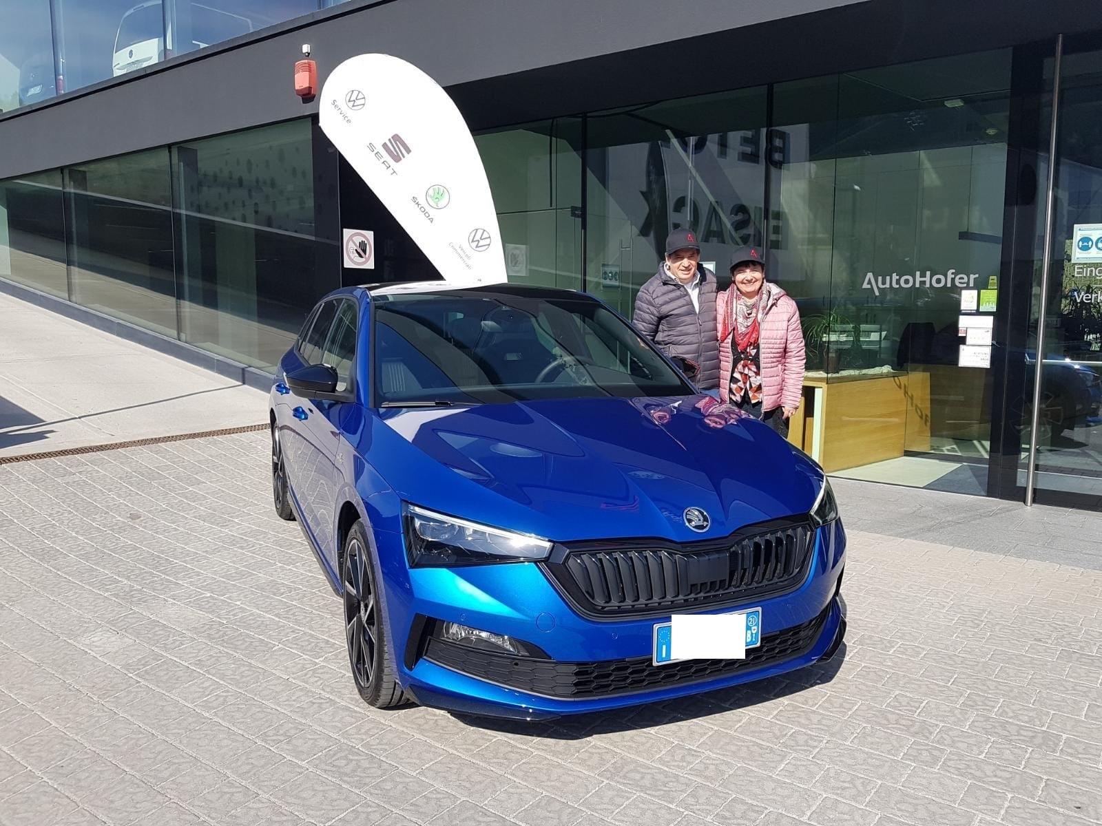 Johannes con sua moglie Hana alla consegna della loro nuova Skoda Scala Montecarlo! Con questo colore straordinario sarete sicuramente l'attrazione sulle strade dell'Alto Adige. Inoltre, gli elementi di design neri danno alla Skoda Scala Montecarlo un aspetto sportivo. Caro Johannes, auguriamo a te e a tua moglie tanto divertimento e naturalmente molti viaggi sicuri!