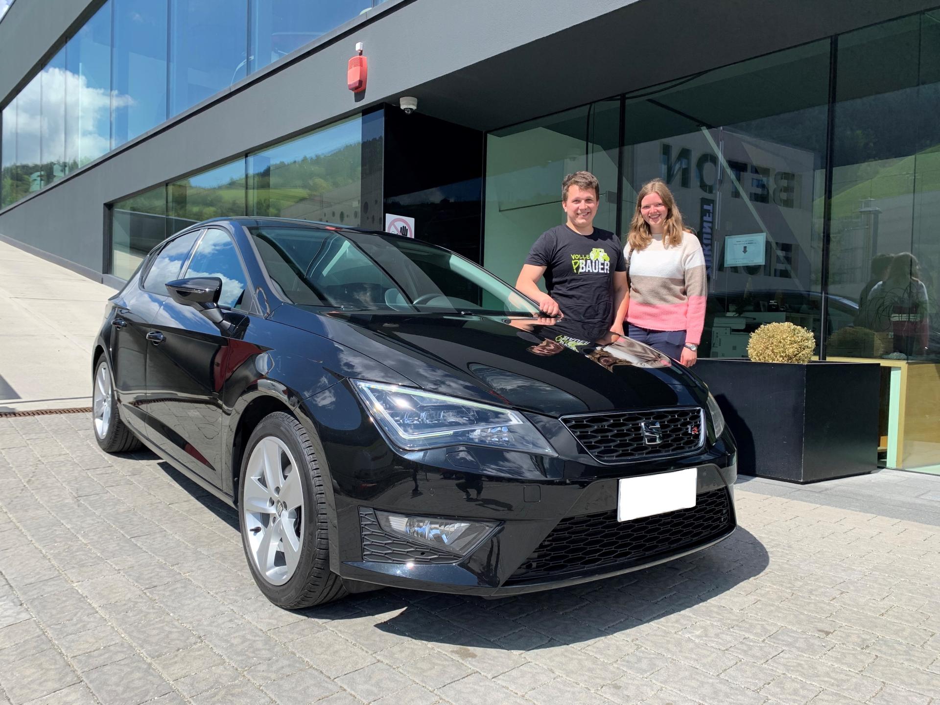 Hannes al ritiro del suo nuovo compagno affidabile su quattro ruote! La Seat Leon FR prende cura della tua sicurezza fino all'ultimo dettaglio, in modo che tu puoi concentrarti sulle cose più belle della vita e goderti le tue avventure in modo rilassato. E con la linea di equipaggiamento "FR", non ti mancherà nulla, in quanto la sportività e l'eleganza continuano negli interni. Caro Hannes, ti auguriamo tanta gioia e soprattutto grande divertimento con il tuo SUV di Seat!