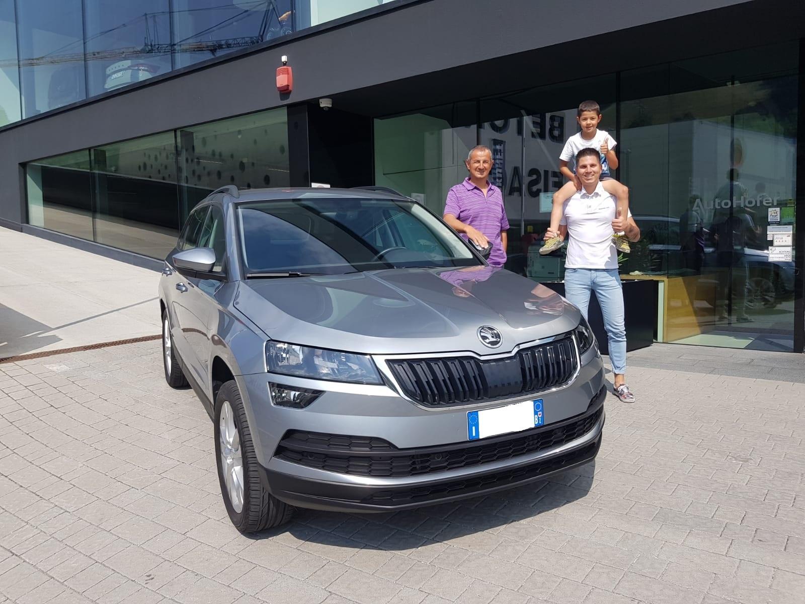 Engelbert con suo nipote Manuel e il nostro collaboratore Alex alla consegna della sua Skoda Karoq 2.0 TDI Style con trazione integrale. Un look fresco che assicura affidabilità e sicurezza. Ma non solo: la Skoda Karoq 2.0 TDI colpisce per il suo carattere classico e sportivo da SUV, che continua anche negli interni: ampio spazio, equipaggiamento di comfort e naturalmente numerosi sistemi di assistenza. Caro Engelbert, ti auguriamo un buon viaggio.