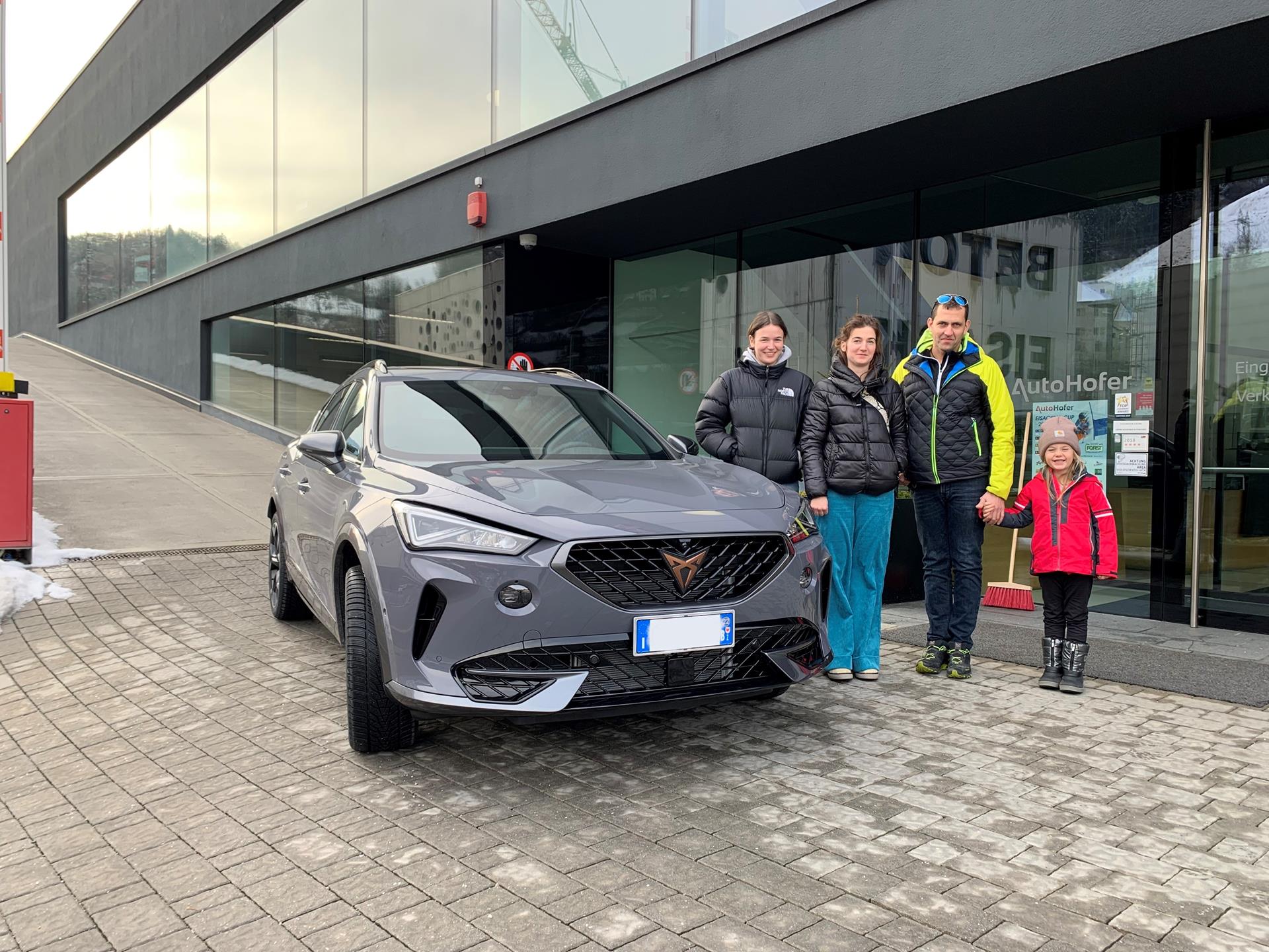 Sportivo, moderno, dinamico. Anche per la famiglia Thomaser, questa Cupra Formentor è la nuova compagna di viaggio sulle strade dell'Alto Adige! Che si tratti di dettagli sorprendenti oppure dell'eleganza degli interni, la vettura sportiva convince in tutto e per tutto. Ma non lascia nulla a desiderare, nemmeno in termini di comfort. Vi auguriamo tanta gioia e soprattutto tanto divertimento con il vostro nuovo compagno su quattro ruote!